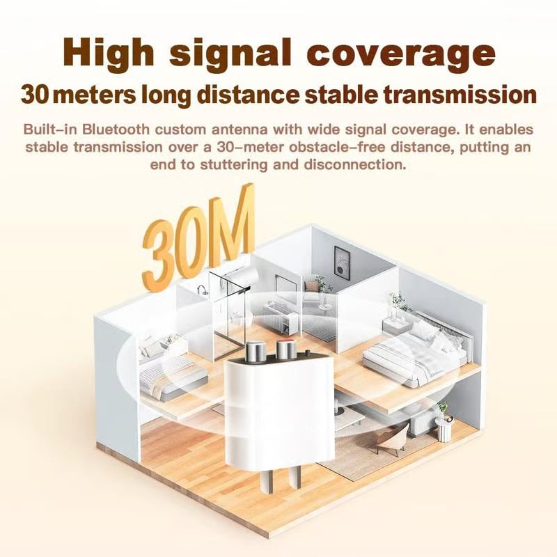 Stable Transmission🎶: Compatible with any audio system, featuring a space-saving design. High signal coverage with stable transmission over 30 meters.